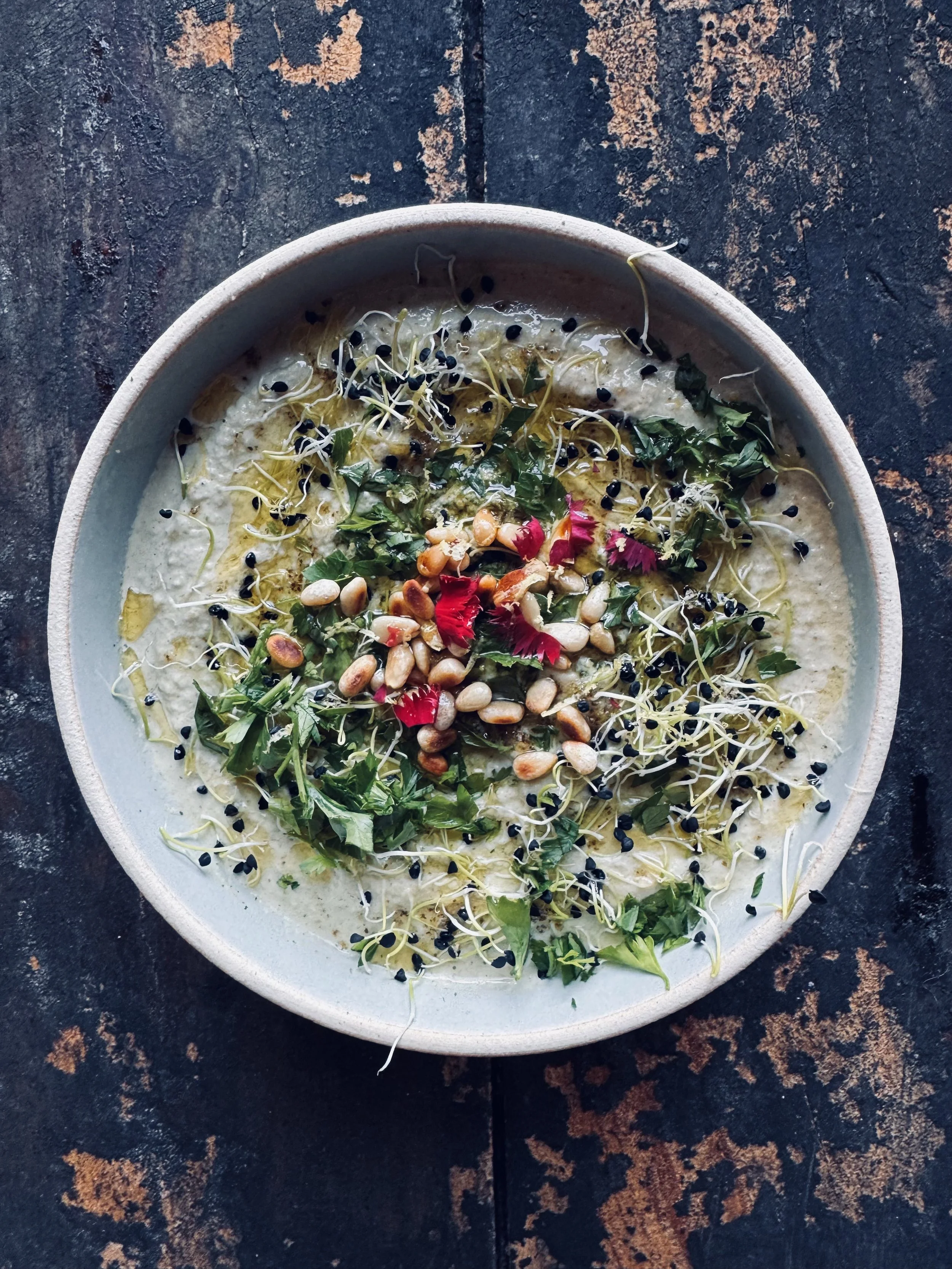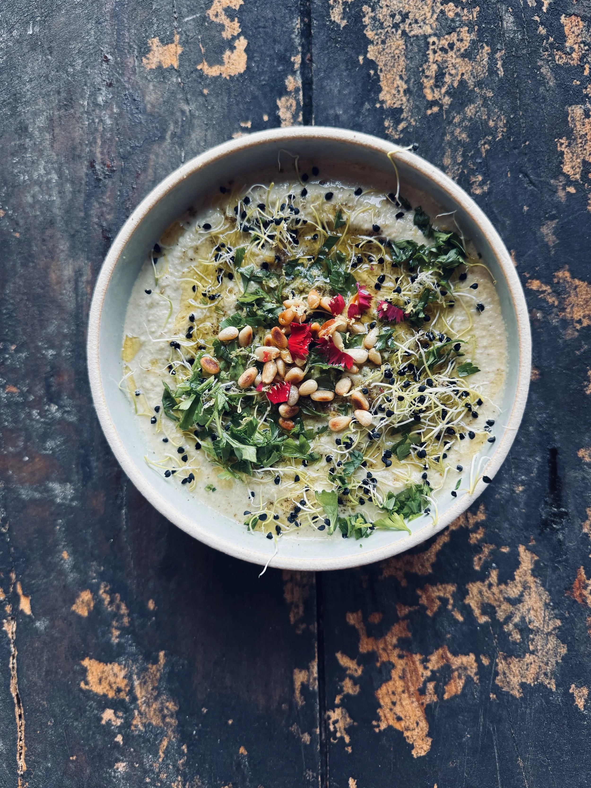 When ready to serve, garnish with a drizzle of olive oil, chopped parsley, freshly cracked pepper, and, if desired, edible flowers or sprouts.