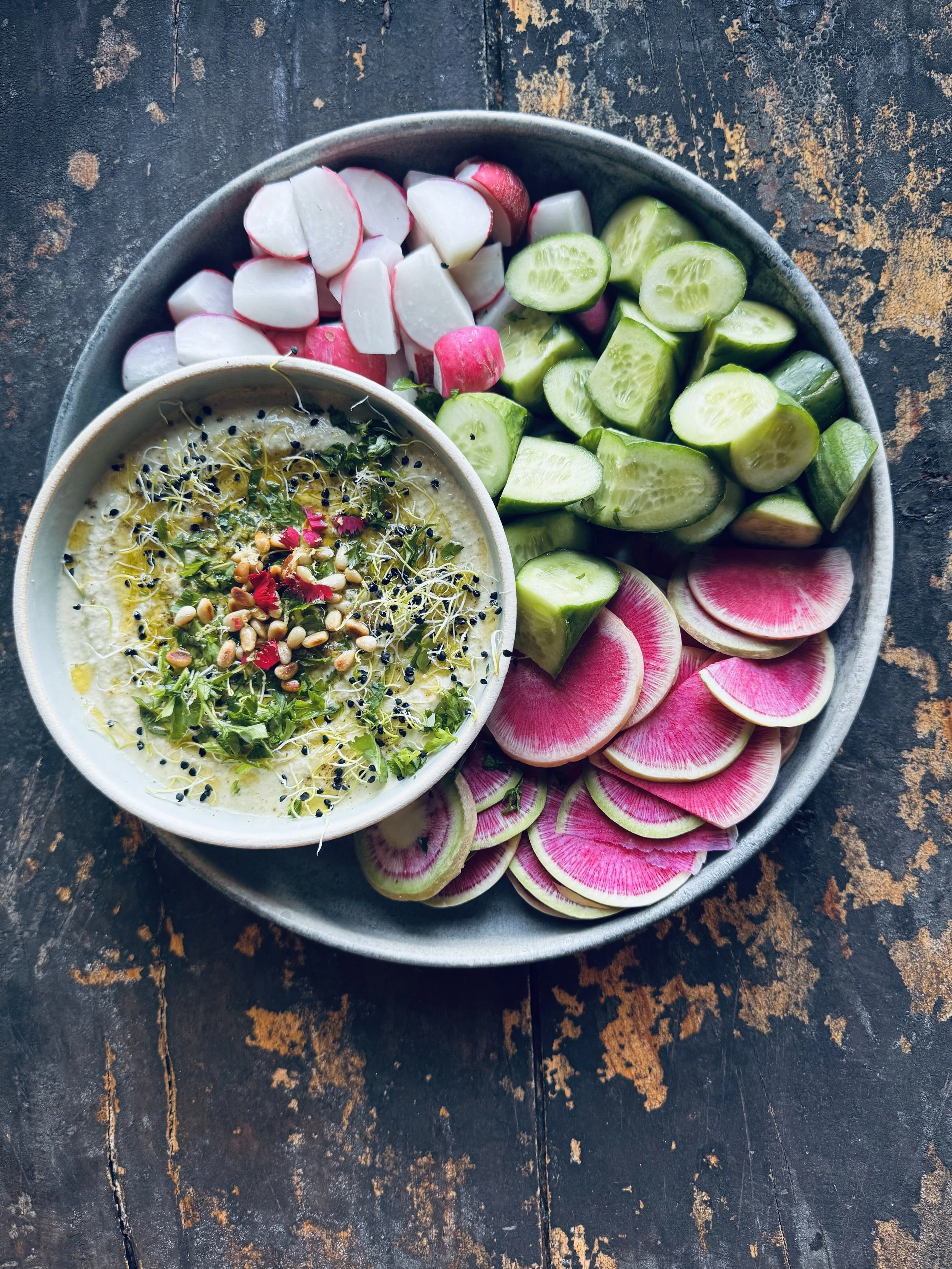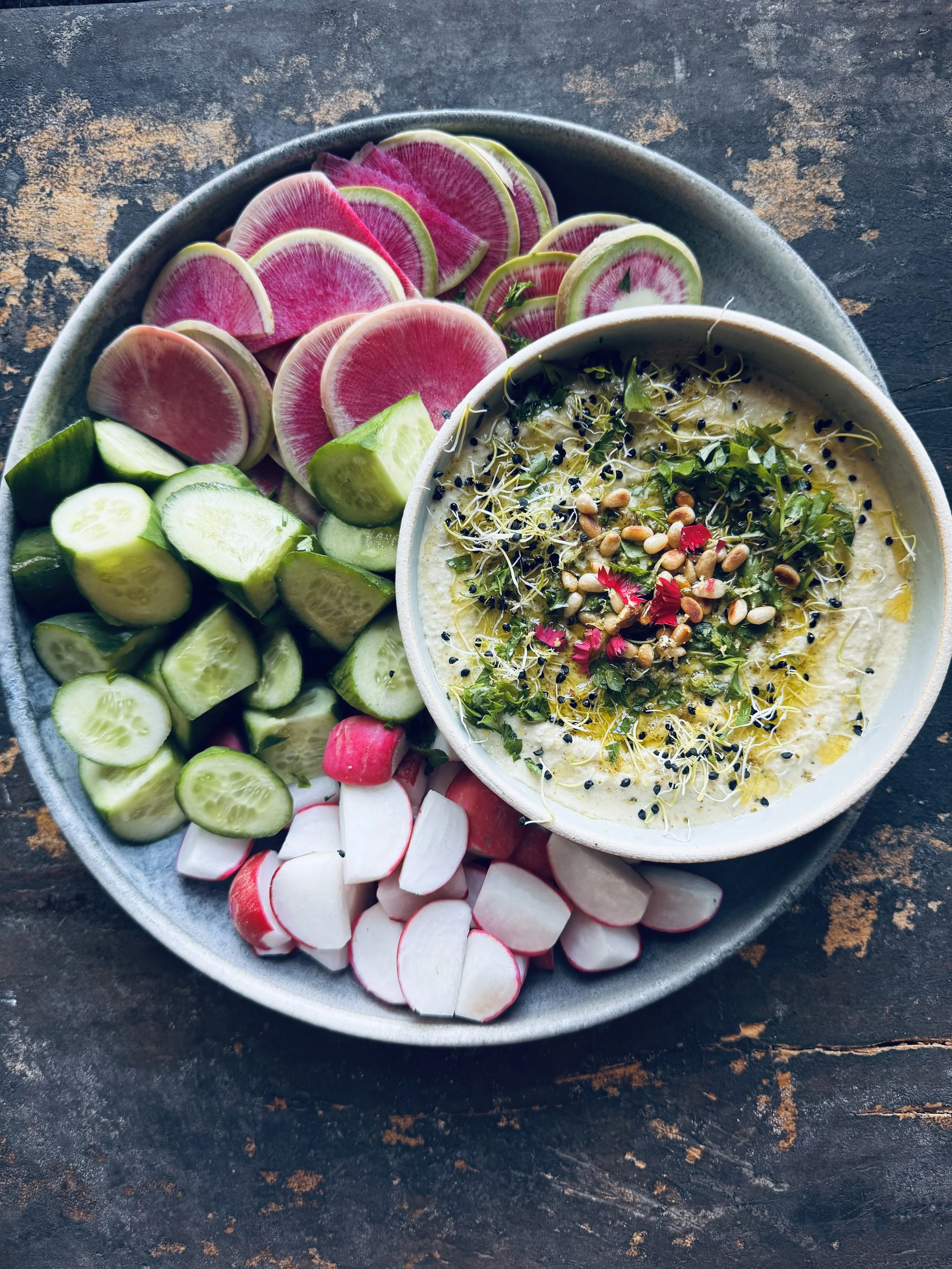 This bean-free version really hits the spot. Even my kids, who adore traditional hummus, love it—and when I recently made it for a group of girlfriends, the response was overwhelmingly positive. I first learned a version of this recipe years ago in a catering kitchen (though I can’t quite remember if it was Akasha or Darra who first taught me that zucchini could stand in for garbanzo beans!). Zucchini are high in dietary fiber, vitamins and minerals. I think this dip is a healthy snack served with crunchy fresh veggies, chips or crackers. A great way to get veggies into kiddos.