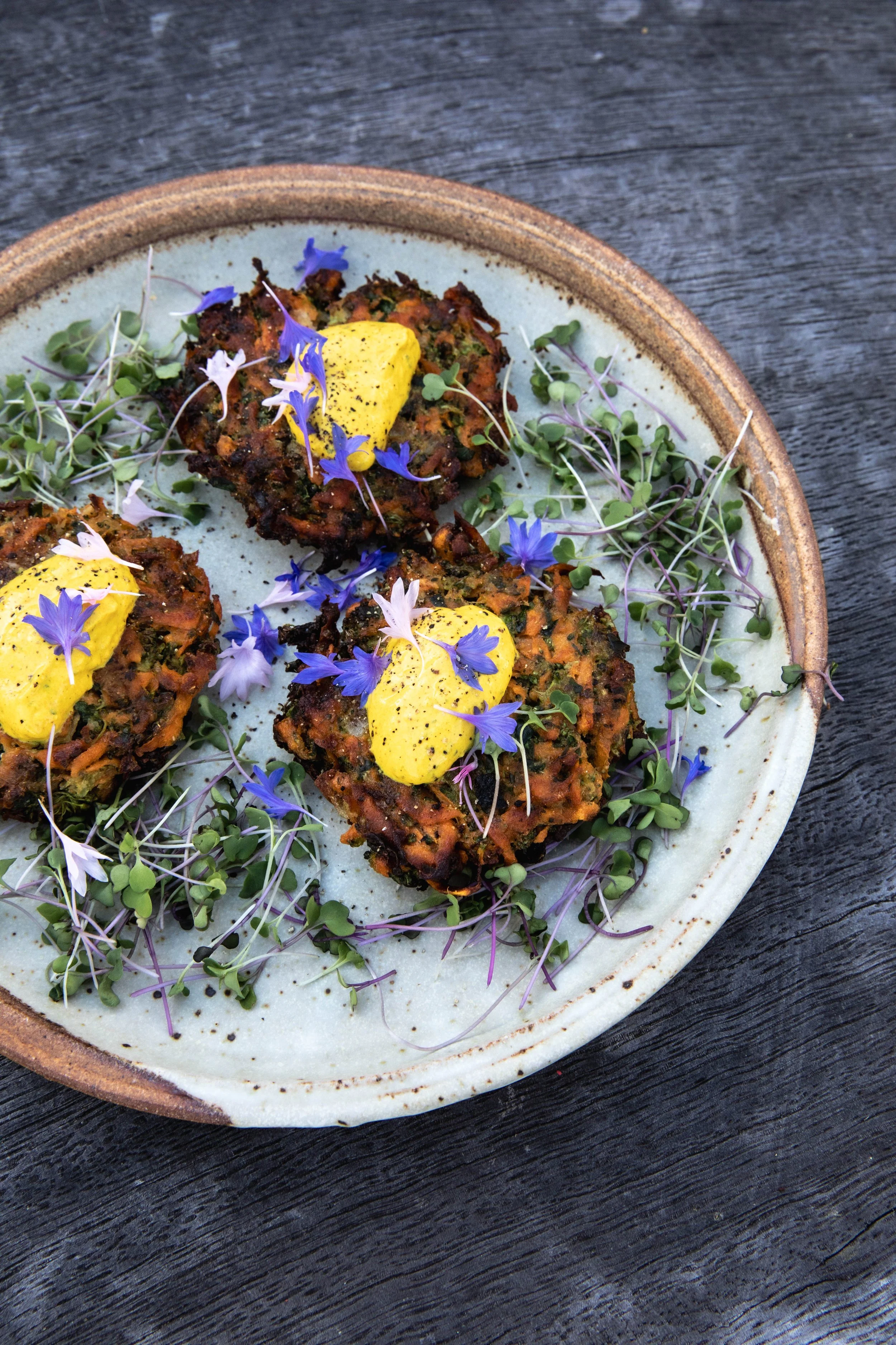 Broccoli Sweet Potato Fritters with Turmeric Spiced Yogurt