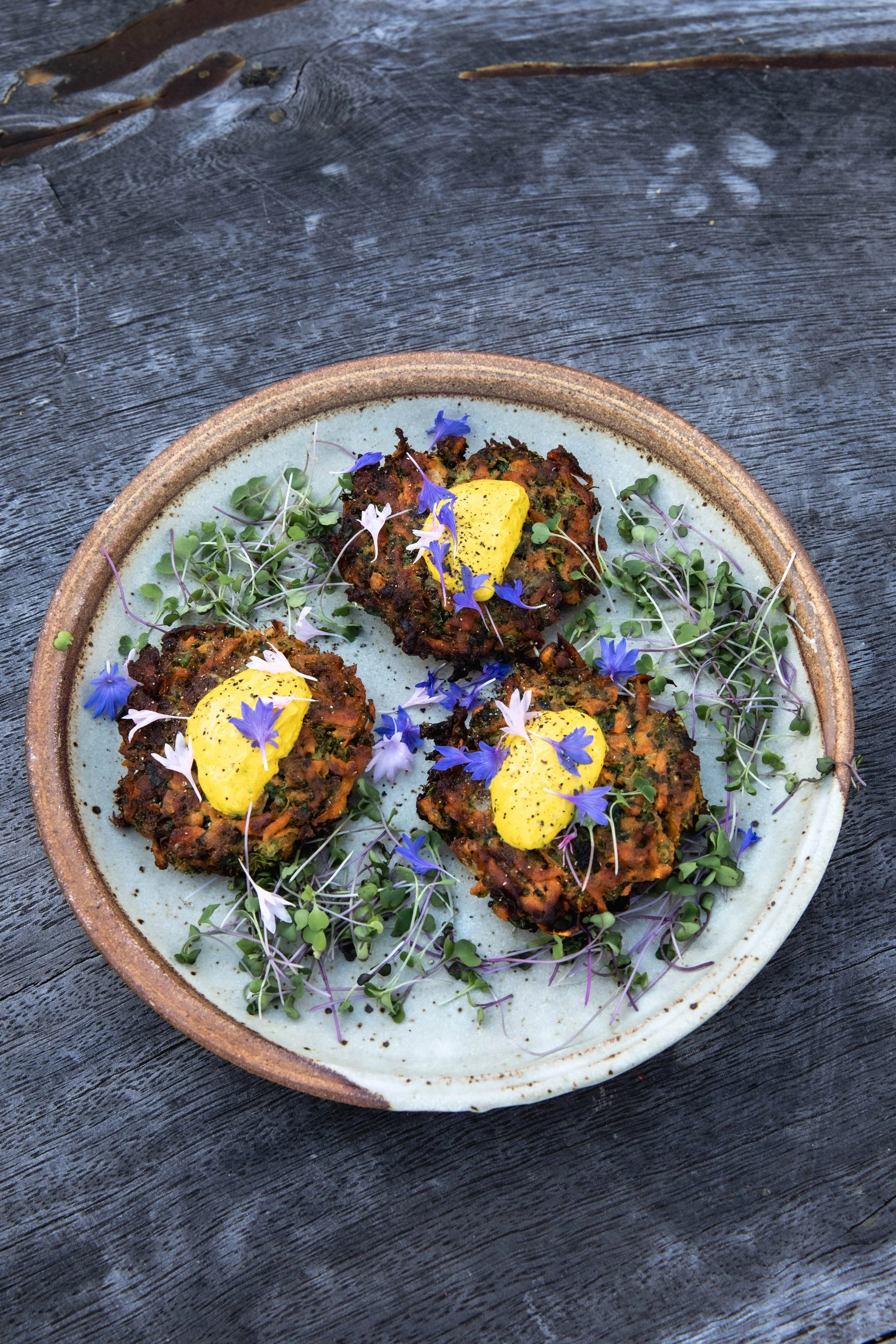 This dish makes a perfect passable appetizer for gatherings—you can easily pick up each fritter with your hands and dip it in the sauce. It also works beautifully as a side dish for brunch, lunch, or dinner, plated with the sauce drizzled over them. Enjoy immediately, or make ahead and reheat on a tray in a 275°F/ 135 C for about 10 minutes before serving.