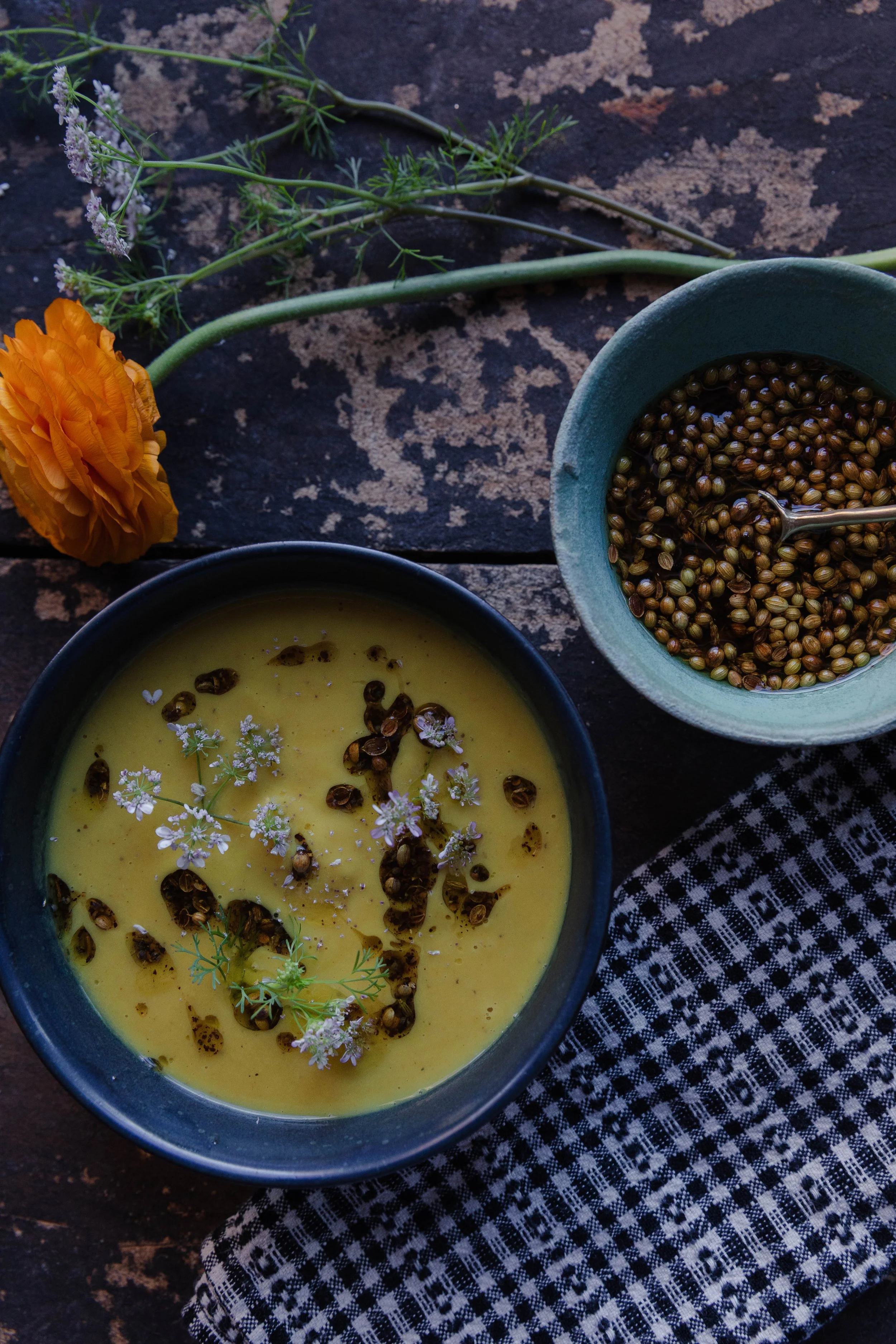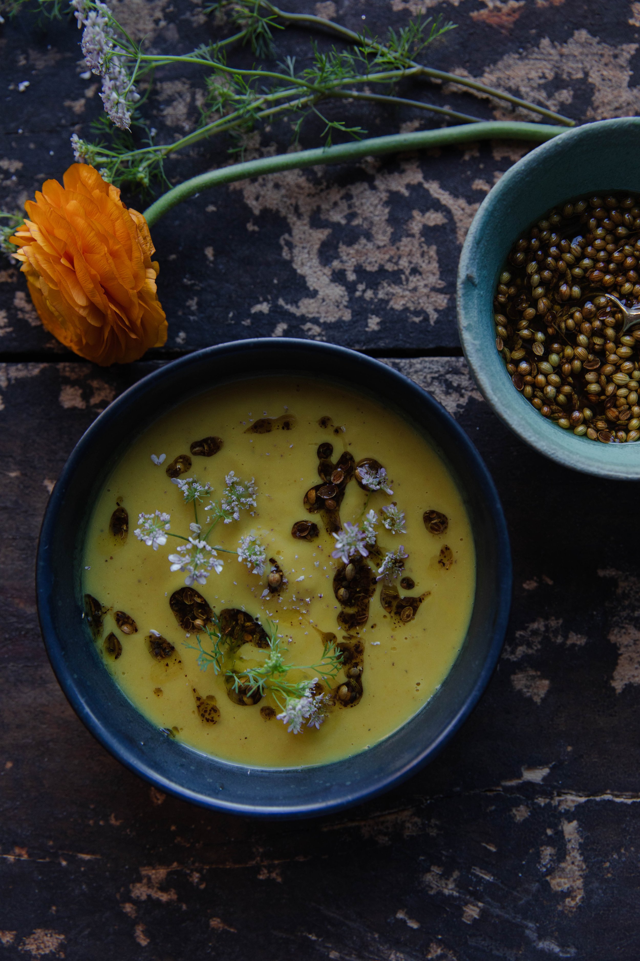 I learned to cook by making soups, and I will always love soup. Although we have moved into spring, the cool evenings still warrant a cozy bowl. In California, cauliflower is still widely available at the farmers market and will peak in April, so there is still time to enjoy this velvety, perfectly spiced soup topped with my latest obsession: Coriander Crunch.