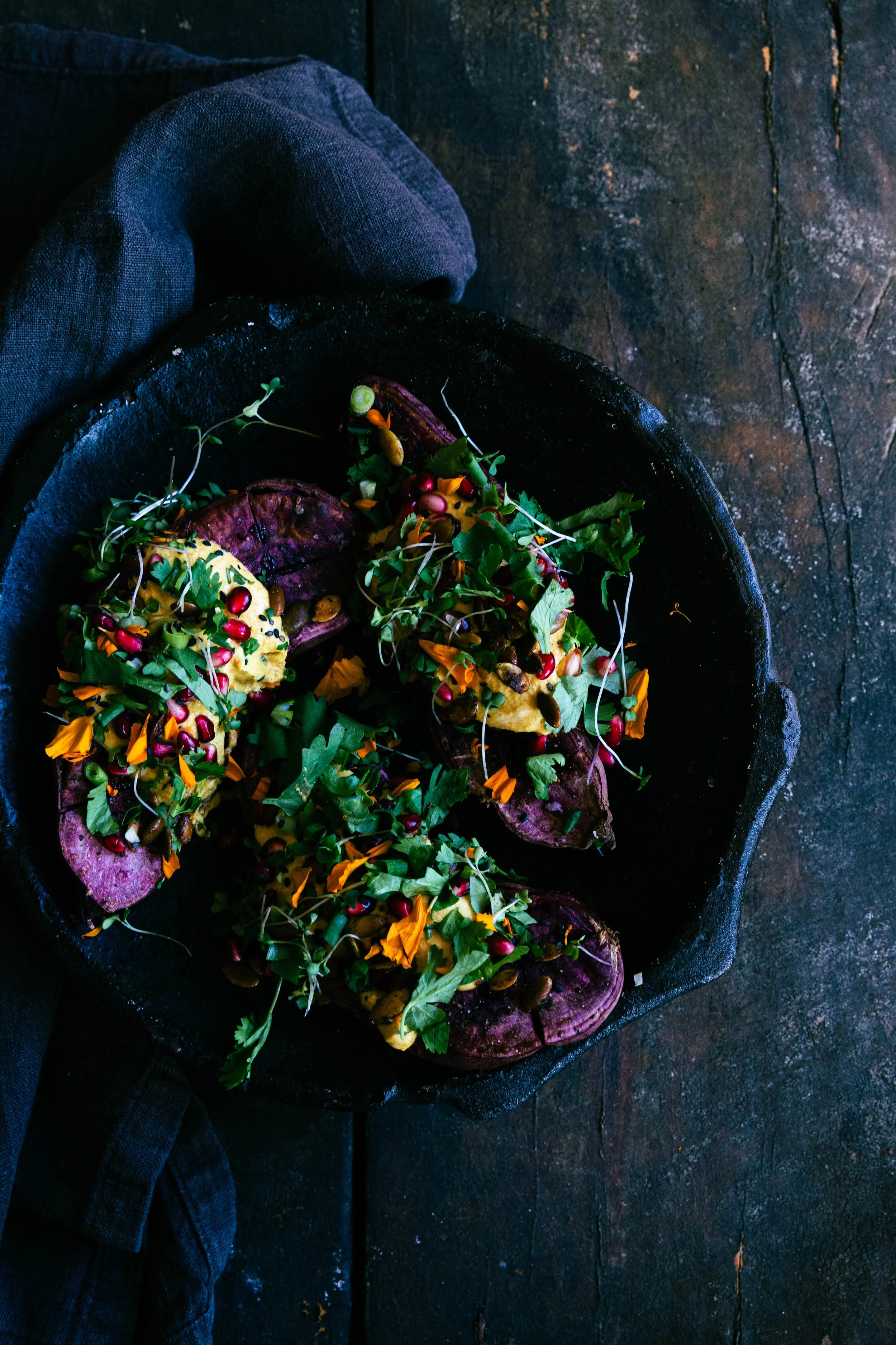 First, prepare the pumpkin seeds. Place the pumpkin seeds, curry powder, coconut sugar, olive oil, and salt into a bowl and mix well until the pumpkin seeds are well coated. Place the seeds onto a large baking tray, and bake for 10-15 minutes. Check at 10 minutes. If the seeds don’t seem browned enough, bake another 5 minutes. Remove from the oven and transfer to a bowl to cool. Bring the oven to 415 F. Cut the sweet potatoes in half, lengthwise, and lay on a small baking sheet. Brush the potatoes with olive oil and sprinkle each with salt and pepper. Place in the oven and bake for 20-25 minutes until the sweet potatoes are fork-tender. Remove from the oven. While potatoes are baking, make your yogurt topping. Combine the coconut yogurt, lime juice, lime zest, turmeric powder, salt, sumac, and olive in a small bowl and mix until well blended. Transfer the potatoes to your serving dish. Spoon a dollop of the turmeric yogurt in the center of your sweet potato, then top with the pumpkin seeds, pomegranate seeds, chopped cilantro, and black sesame seeds. Sprinkle with colorful edible flower petals.